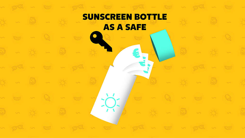 Se končno odpravljaš na sproščujoče kopanje in ne želiš razmišljati o svojih dragocenostih na plaži? Bodi ustvarjalen! Denar, ključe in podobne predmete varno skrij v prazno stekleničko kreme za sončenje.