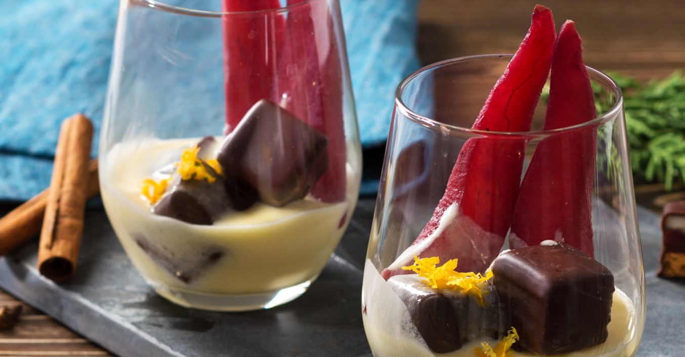 Krušku operi, oguli, nareži na osam krišaka i ukloni joj koštice. Timijan operi. U lončiću pomiješaj 250 ml vode, crno vino i začine te prokuhaj, a zatim dodaj krušku i kuhaj još desetak minuta. Makni sa štednjaka i ostavi sa strane da se hladi.Za kremu prereži mahunu vanilije po duljini i sastruži sjemenke. Čokoladu grubo nareži te stavi u lončić sa sjemenkama vanilije i vrhnjem. Lagano zagrijavaj dok se čokolada ne rastopi, a zatim makni sa štednjaka i umiješaj mlaćenicu.U svaku staklenku rasporedi po dvije kriške kruške, sloj čokoladne kreme i tri Domino kocke te stavi u hladnjak sat vremena. Posluži ukrašeno timijanom.
