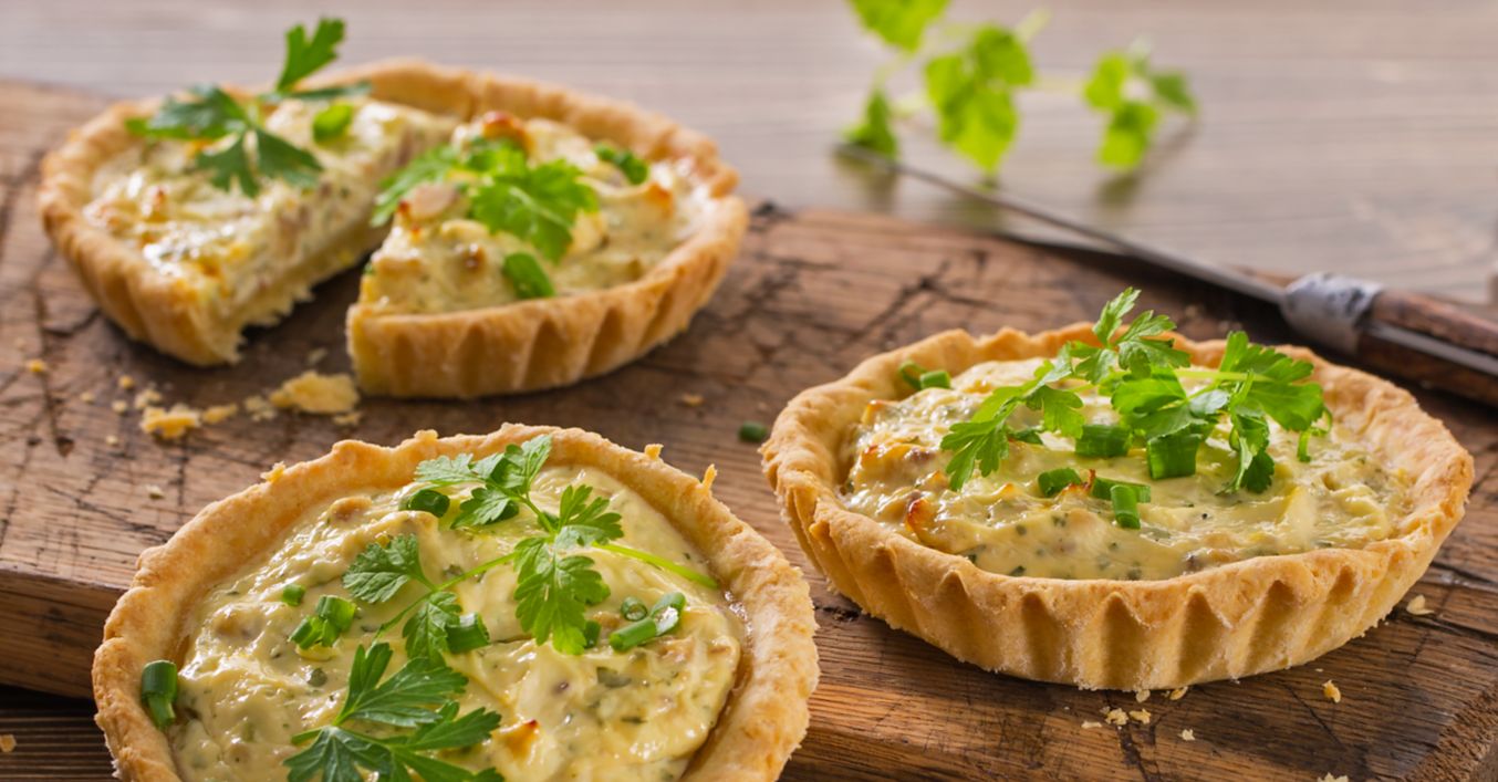 Umijesi glatko tijesto od brašna, maslaca, pola žličice soli, jednog jaja i dvije žlice vode, a zatim ga zamotaj prozirnom folijom i stavite 30 minuta u hladnjak. Limun operi u vrućoj vodi i naribaj jednu žličicu korice. Operi bilje te stavi sa strane po jednu grančicu svake vrste. Ostatak začinskog bilja grubo nasjeckaj, pomiješaj s svježim sirom, jajem i naribanom koricom limuna te zgnječi u pire. Kestene grubo nasjeckaj, začini solju i paprom te umiješaj u smjesu sa sirom i stavi u hladnjak.Ugrij pećnicu na 200°C. Tijesto razvucite na debljinu od pola centimetra, nareži na četiri kvadrata i obloži mini kalupe za pite (promjera 8 cm). Višak tijesta odreži , dno izbodi vilicom, prekrij masnim papirom i na vrh stavi grah kao uteg. Peci 12 minuta u pećnici, a zatim dodaj pripremljeni nadjev i peci još 15 minuta. Pečene mini pite ukrasi začinskim biljem i posluži.