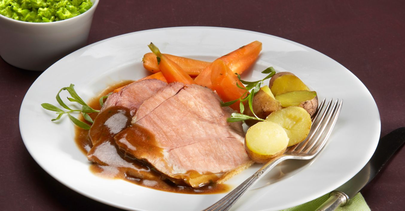 Dodajte ostatak vrhnja i estragona u umak, prokuhajte te malo zgusnite brašnom razmućenim u vodi. Janjeći but narežite na kriške te poslužite s umakom, mrkvama, pireom od graška i kuhanim mladim krumpirima. Pospite sjeckanim peršinom.