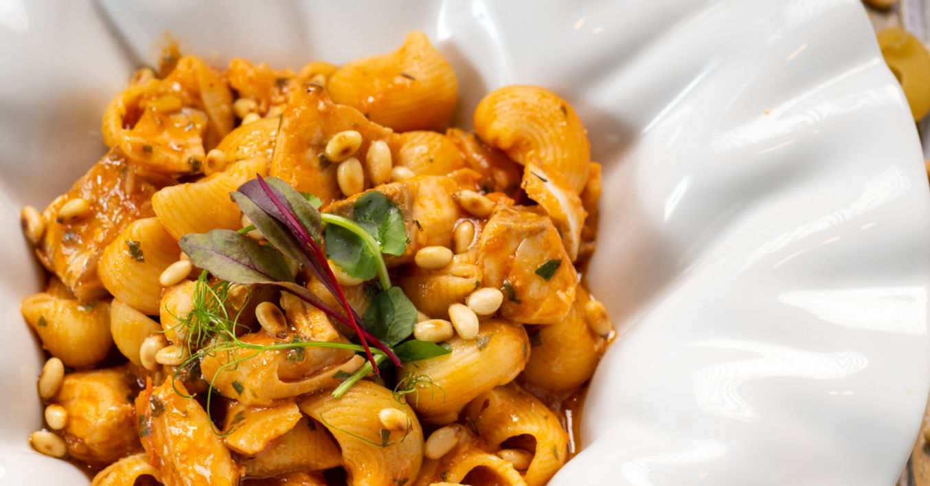 Kad vino ispari, dodamo pelate, sol, papar i po želji prstohvat šećera i kajenskog papra. Kuhamo oko 15 minuta, podlijemo temeljcem od bakalara te ubacimo tjesteninu koju smo posebno skuhali na 80%. Sve zajedno kuhamo dok tjestenina ne bude al dente a umak gušći. Serviramo i pospemo tostiranim pinjolima ili nekim drugim orašastim plodom.