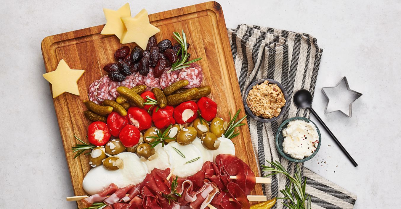 Mozzarellu i salamu narežite na ploške, a pršut nanižite na ražnjiće u obliku harmonike te zajedno s ostalim sastojcima posložite u obliku božićnog drvca na drvenu dasku.