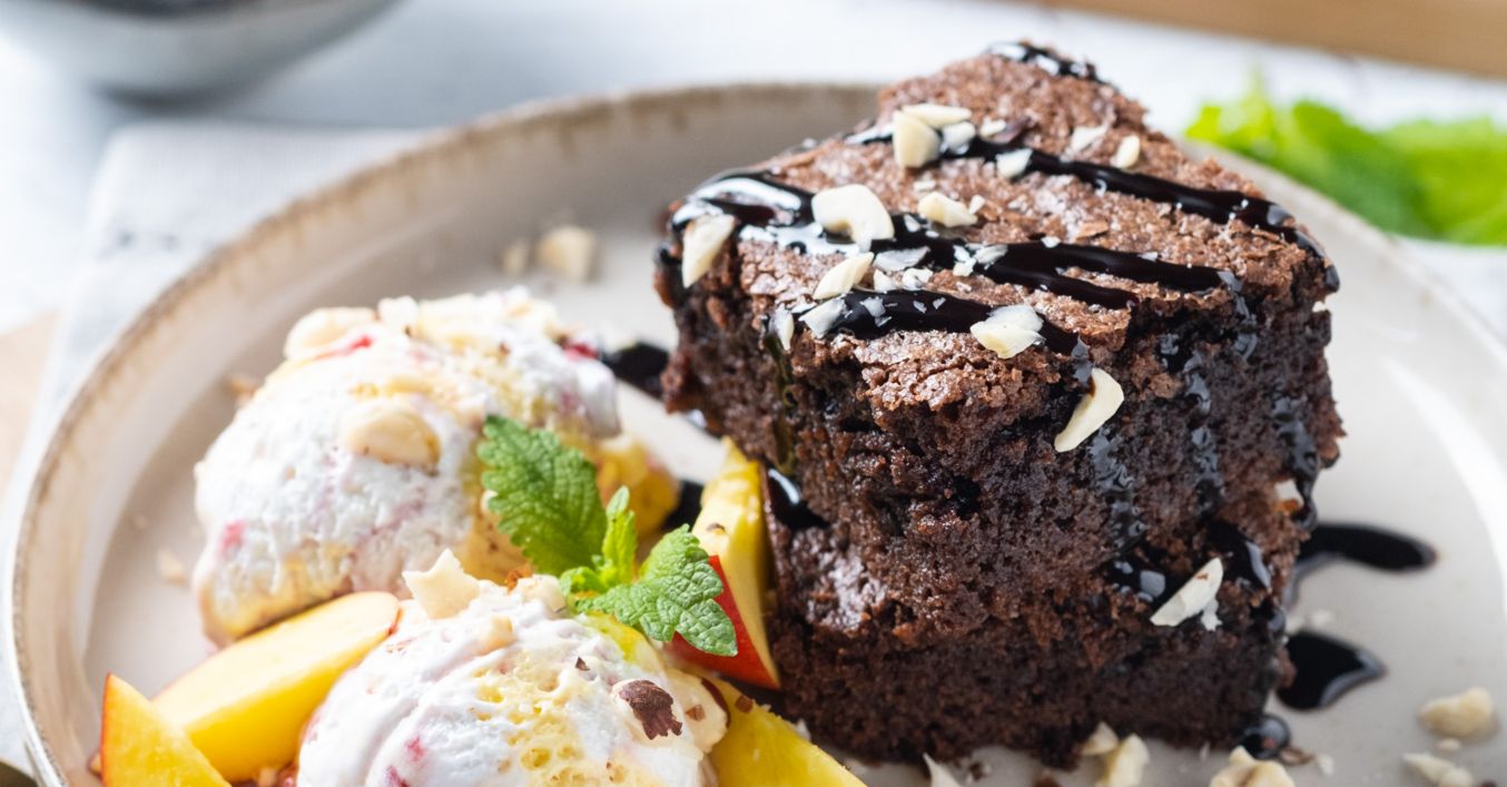 Kolač nareži na kocke te ga posluži uz kuglice sladoleda i voće pa prelij čoko preljevom i pospi lješnjacima.