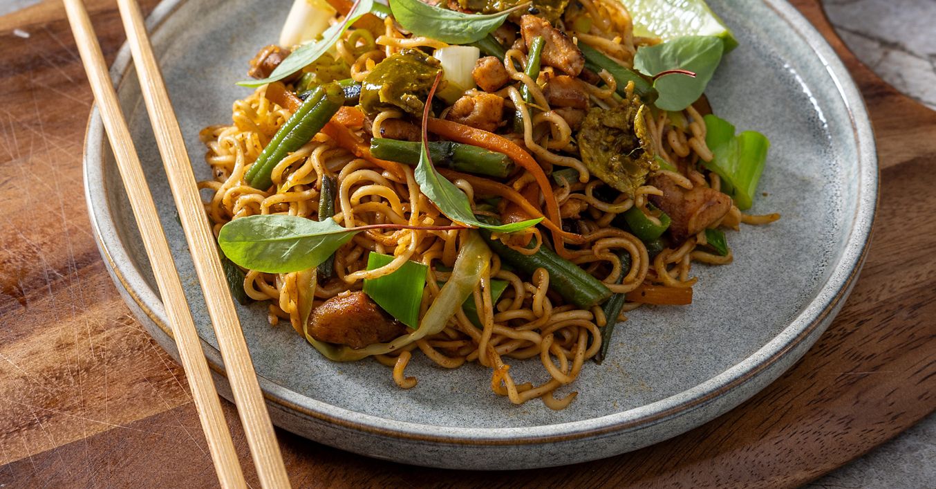 U tavu dodaj đumbir, češnjak, masala prah, chili prah, crni papar, skuhane noodlese, soja umak, curry pastu i sve dobro promiješaj. Na kraju umiješaj i mladi luk.