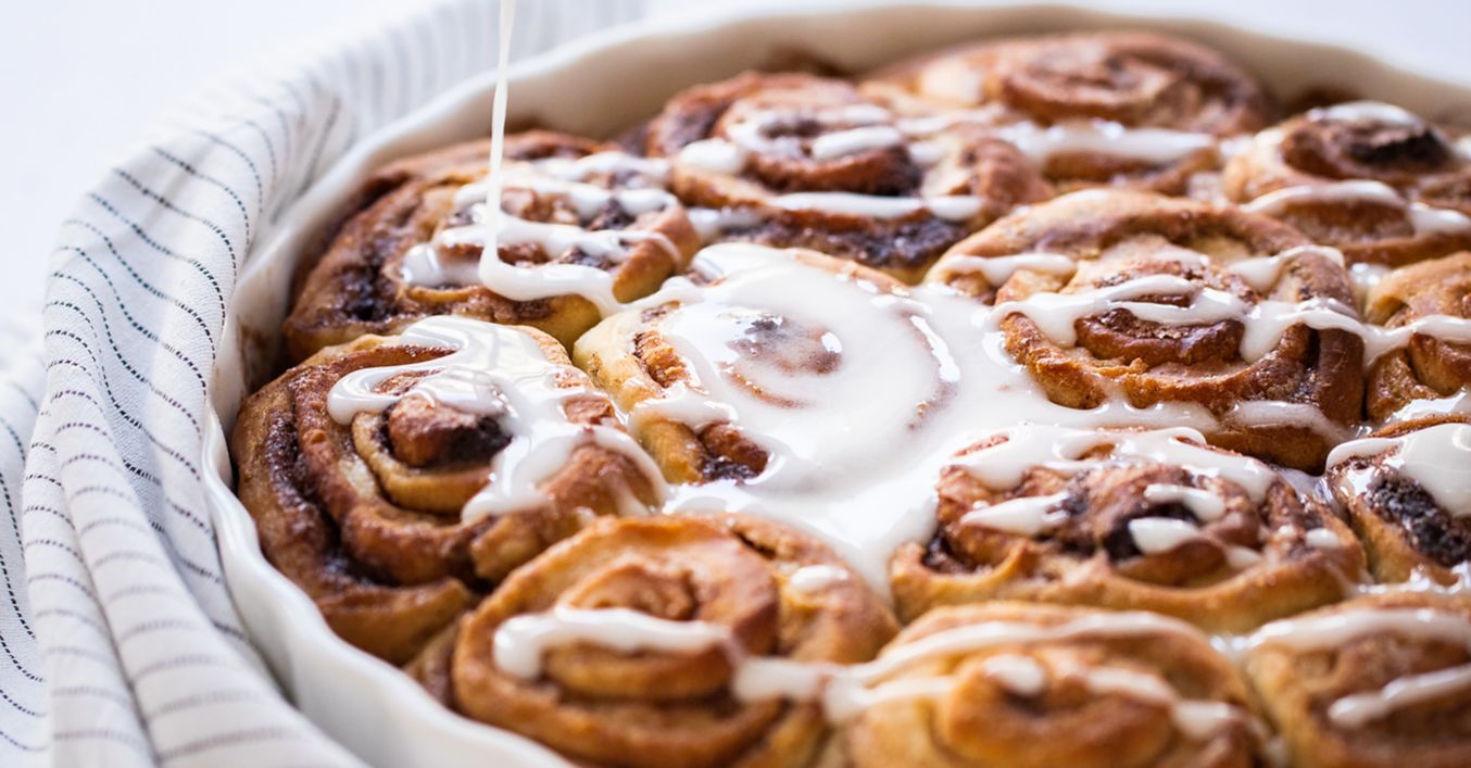 Svježe pečene cimet rolice prelij šećernim preljevom.