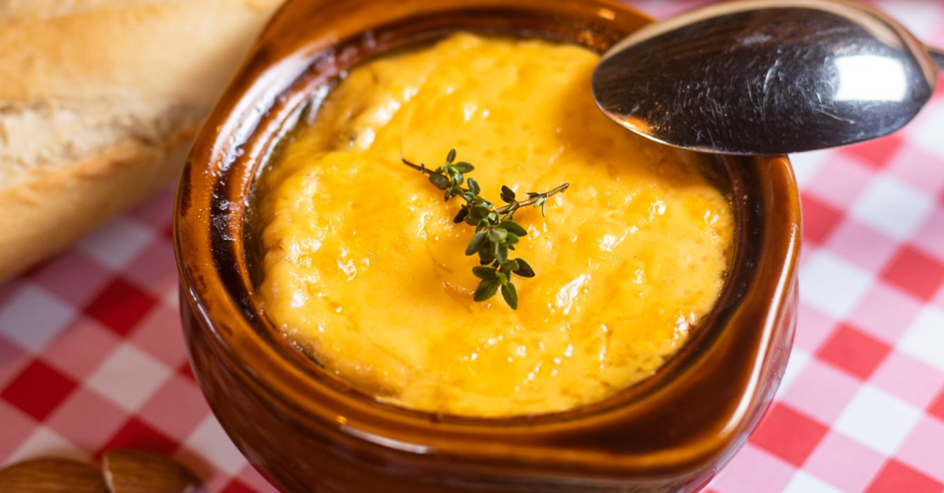 Baguette tostiraj pa ga položi na vrh juhe. Preko njega stavi sir koji možeš kratko zapeći u pećnici da se otopi. Dobar tek!