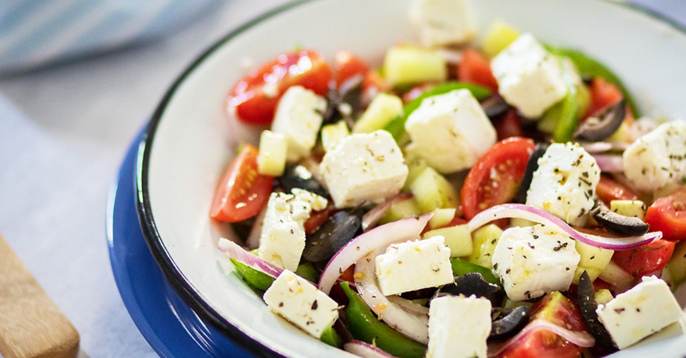 Povrće očisti, operi i osuši. Rajčice nareži na kriške. Krastavac prereži po duljini, očisti sjemenke i nareži na ploške. Luk nareži na ploške, a maslinama izvadi koštice i prereži ih na polovice.
