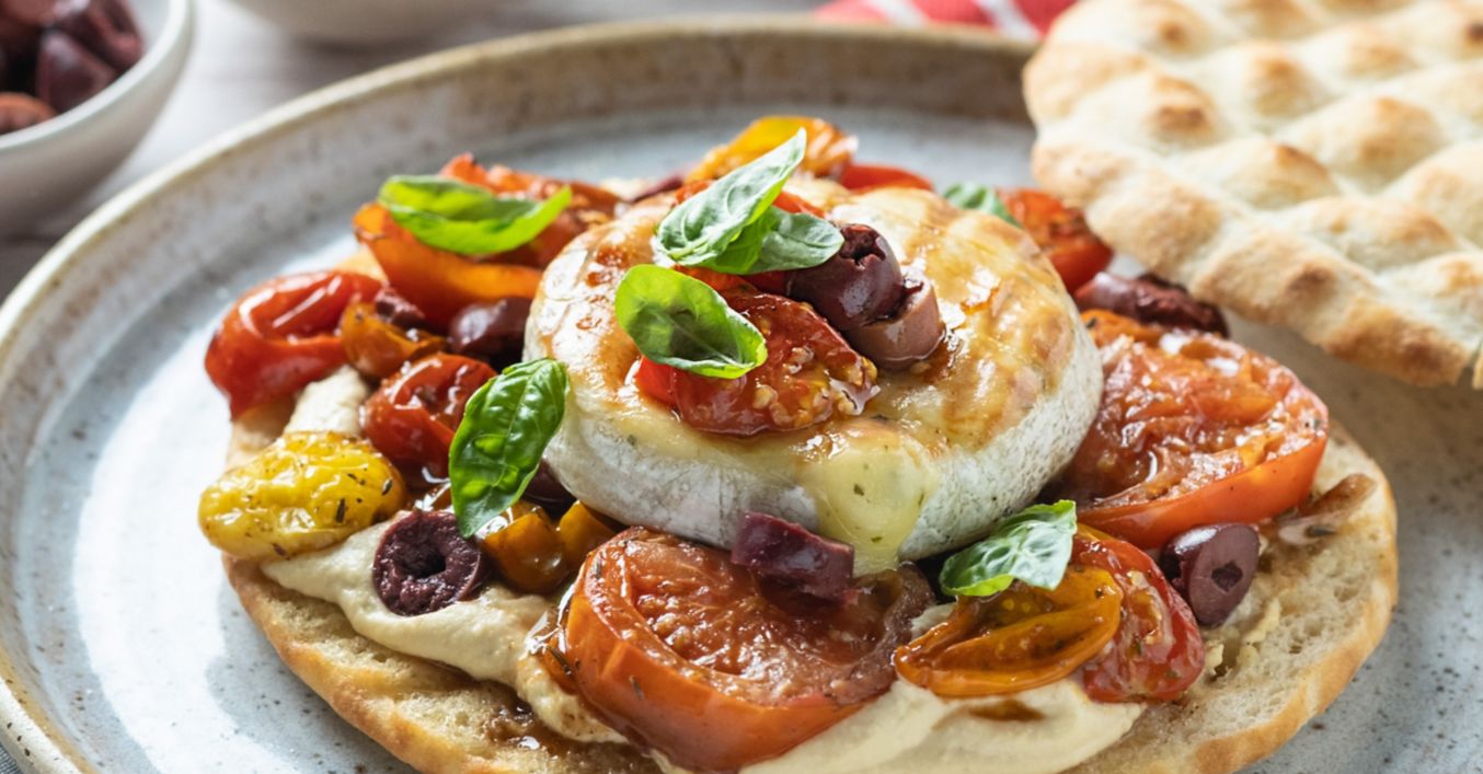 Grill sir s pečenim rajčicama, maslinama i humusom