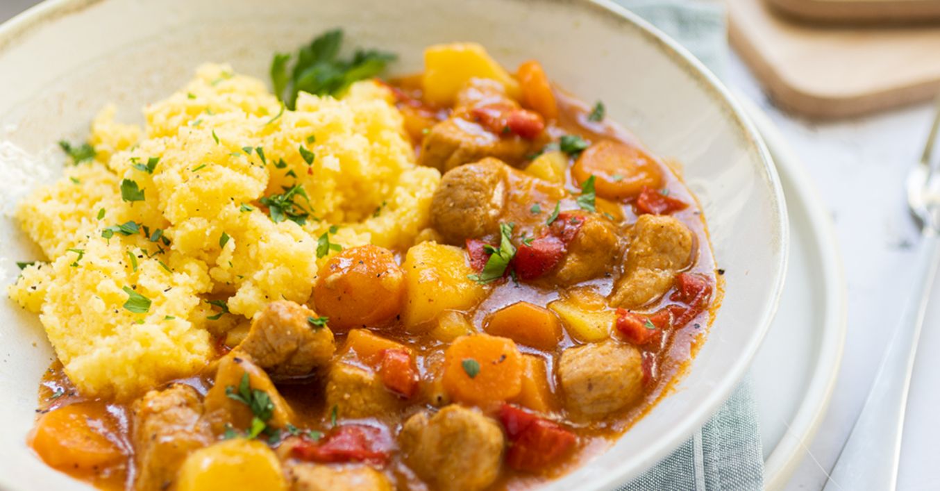 Luk usitni na kockice, mrkvu na kolutove, papriku na trakice, a krumpir na veće kockice. U loncu zagrij 2 žlice maslinovog ulja pa preprži kockice svinjetine dok ne dobiju zlatnu boju. Radi ovo u više tura kako se meso ne bi počelo kuhati.