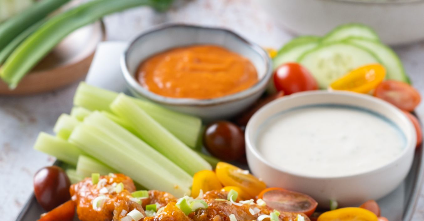 Uz krilca posluži svježe narezano povrće poput krastavca, celera i cherry rajčica te uz ostatak ljutog umaka i umak od češnjaka. Na kraju krilca pospi sitno nasjeckanim mladim lukom.