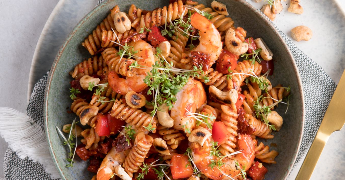 Integralna tjestenina s kozicama, rajčicama i paprikom
