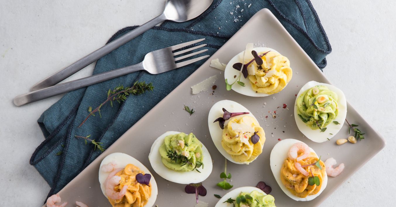 Skuhaj jaja utvrdo, oljušti ih i prepolovi. Žumanjak ukloni i zgnječi vilicom te pomiješaj s majonezom. Začini koricom limuna i solju te odmah podijeli na tri dijela. Prvi dio pomiješaj sa senfom, parmezanom i papromm. U drugoj posudi pomiješaj nasjeckani češnjak, listiće bosiljka i timijana, a zatim dodaj grubo nasjeckane pinjole. Umiješaj u drugu smjesu od jaja.