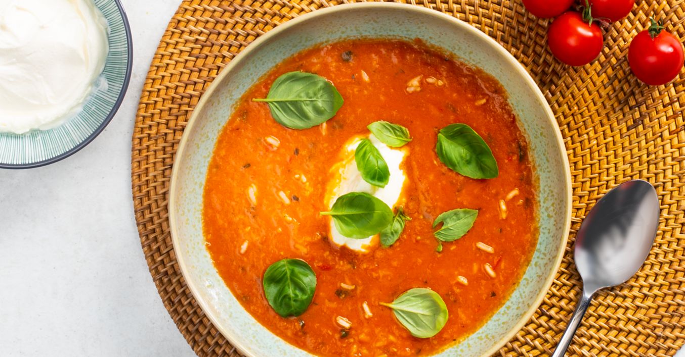 Bosiljak oprati, otkinuti listiće i dio ostaviti sa strane za dekoraciju. Preostali bosiljak ubaciti u juhu. Dobro izmiksati štapnim mikserom. Kuhanu rižu dodati u juhu i začiniti balzamičnim octom, soli, paprom i šećerom. Po potrebi juhu još jednom zakuhati i poslužiti u tanjure sa žlicom kiselog vrhnja i preostalim listićima bosiljka.