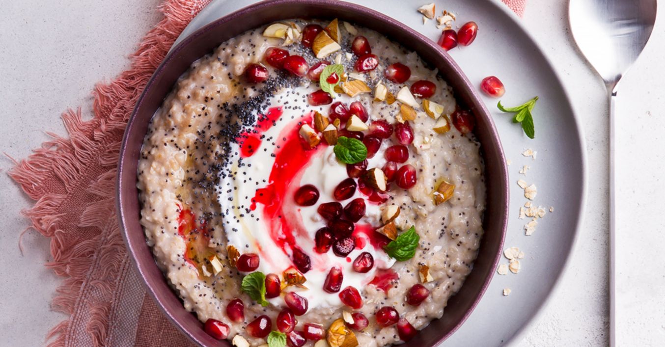 Kašu napunite u zdjelice, poslužite prelivenu preljevom od jogurta, zrnima nara, bademima i javorovim sirupom.