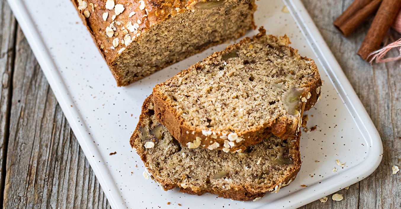 Treću bananu prereži na pola po dužini i stavi na vrh kolača. Sve pospi s još malo zobenih pahuljica.