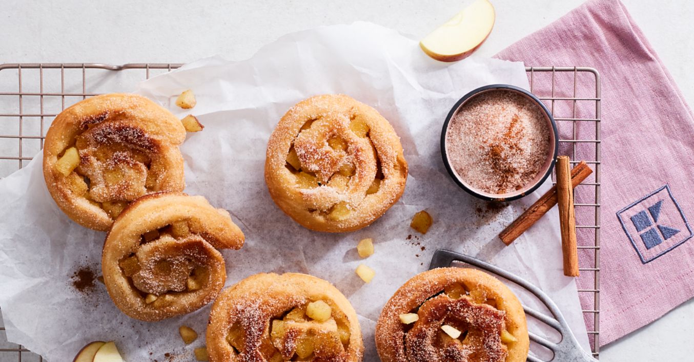 Dignuto tijesto staviti na pobrašnjenu radnu površinu i valjkom razvaljati u pravokutnik veličine 45 x 35 cm. Po vrhu rasporediti jabuke narezane na kockice i čvrsto zarolati tijesto po dužoj strani. Rezati na kriške debljine oko 2,5 cm. Lim za pečenje posuti s malo brašna, na njega položiti kolutove tijesta na udaljenosti od oko 3 cm i ostaviti ih pokrivene još 10 minuta.
