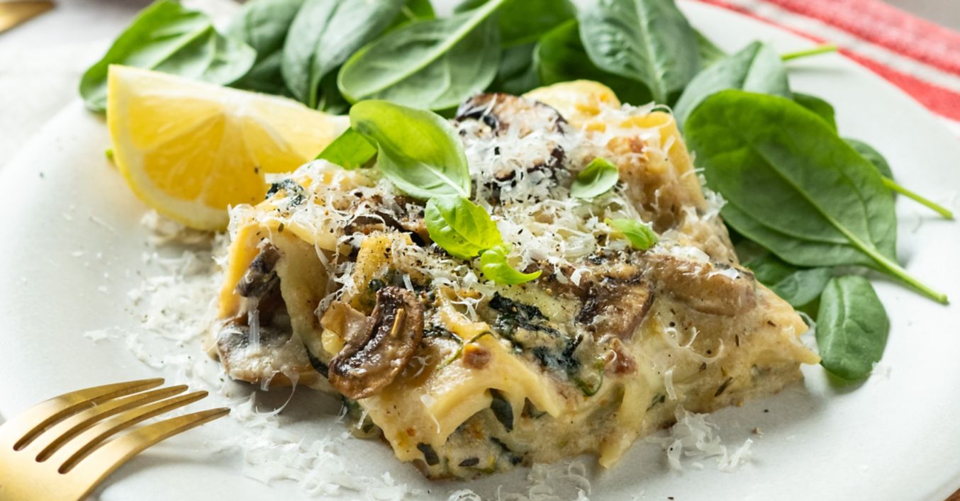 Trećinu listova lazanja rasporedi po tavi i potopi ih. Dodaj pola količine špinata i trećinu gljiva. Zatim poklopi s novom trećinom listova lazanja, drugom polovicom špinata i drugom trećinom gljiva. Na kraju posloži zadnju trećinu listova lazanja. Poklopi tavu i pusti da se sve kuha 15-ak minuta.