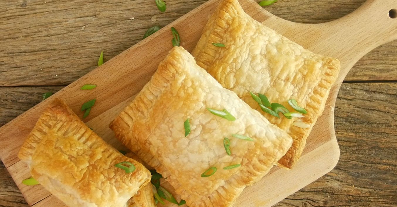 Mrkvu ogulite i naribajte. Mladi luk narežite na tanke ploške, a krastavce na kockice. Lisnato tijesto odmrznite.Kockice tofua pomiješajte s krastavcima, mrkvom, graškom, mladim lukom, namazom te začinite solju i paprom.Smjesu rasporedite na 12 komada lisnatog tijesta. Rubove premažite s malo vode, pa preklopite. Vilicom stisnite rubove kako nadjev ne bi iscurio.Pecite 30 minuta u pećnici, prethodno zagrijanoj na 200°C.