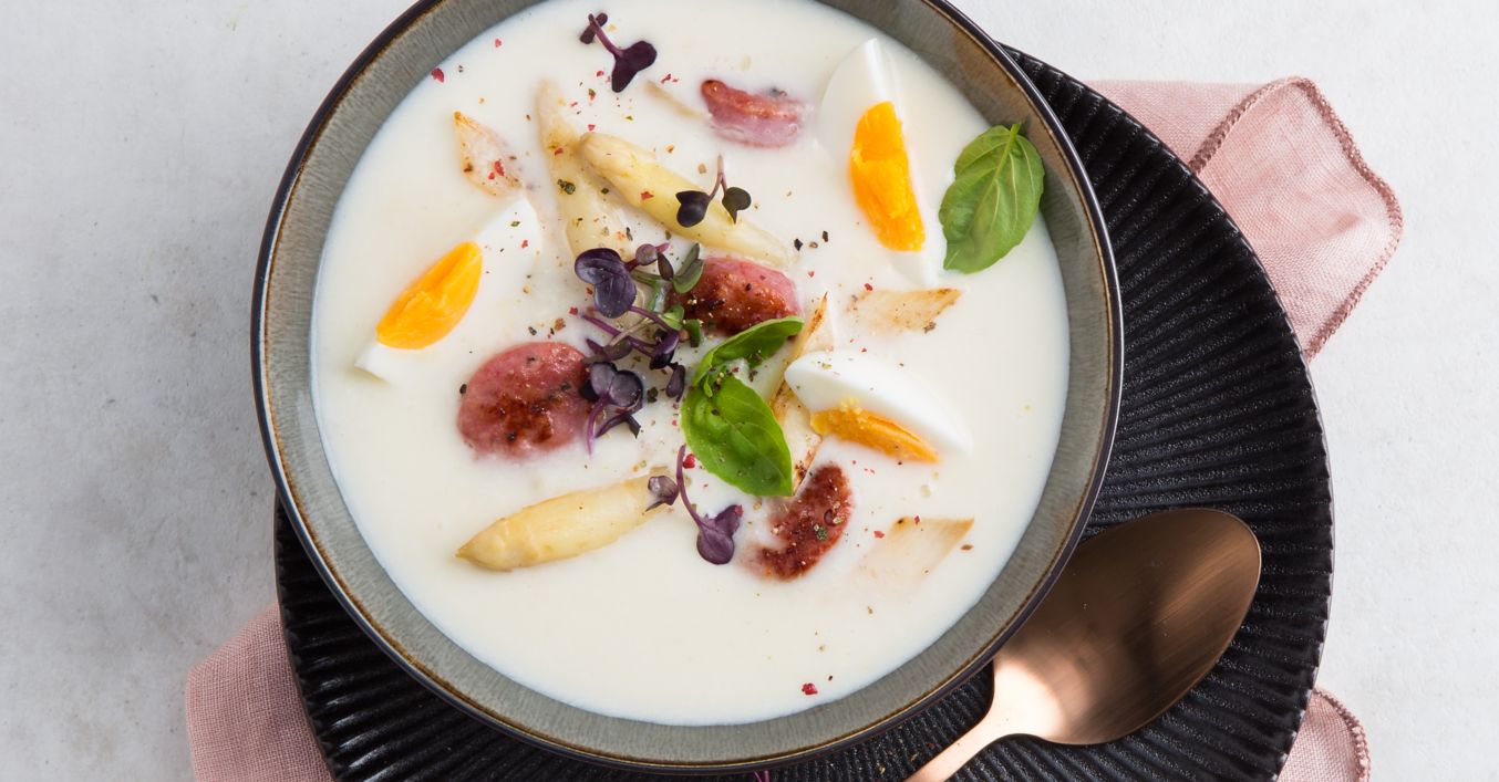 Juhu smiksaj te začini vrhnjem, solju, paprom i muškatnim oraščićem. Dodaj kobasicu i vrhove šparoga te ukrasi listićima bosiljka.