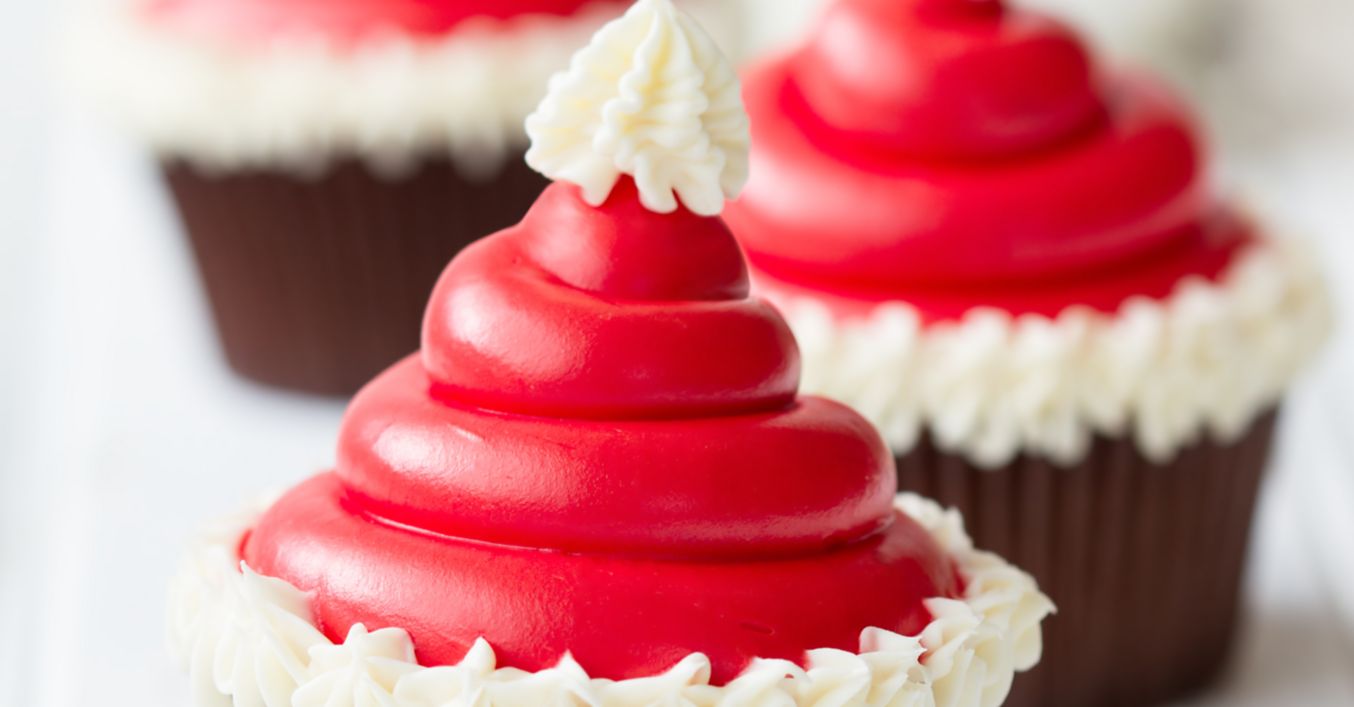 Krema: Maslac istuci dok ne postane pjenast. Dodaj šećer u prahu i esenciju jagode pa miksaj dok se sve ne sjedini. Dolij mlijeko pa miksaj najjačom brzinom dok ne dobiješ laganu i pahuljastu kremu od maslaca. Po potrebi dodaj mlijeka.Otprilike 1/4 kreme od maslaca odvoji za bijelu glazuru u koju ćeš umiješati nekoliko kapi bijele boje. Kremu premjesti u malu vrećicu (špricu) s nastavkom u obliku zvijezde.Crvenu prehrambenu boju umuti u ostatak dok ne dobiješ jarko crvenu kremu. Prebaci u veliku vrećicu (špricu) s nastavkom u obliku kruga.Kako bi formirao glavni dio šešir, pažljivo nanesi crvenu kremu na ohlađene muffine (ostavi pri dnu prostora za bijeli rub). Od bijele kreme napravi male zvjezdice oko crvene glazure. Za kraj nanesi malo veću bijelu zvijezdu na vrh.