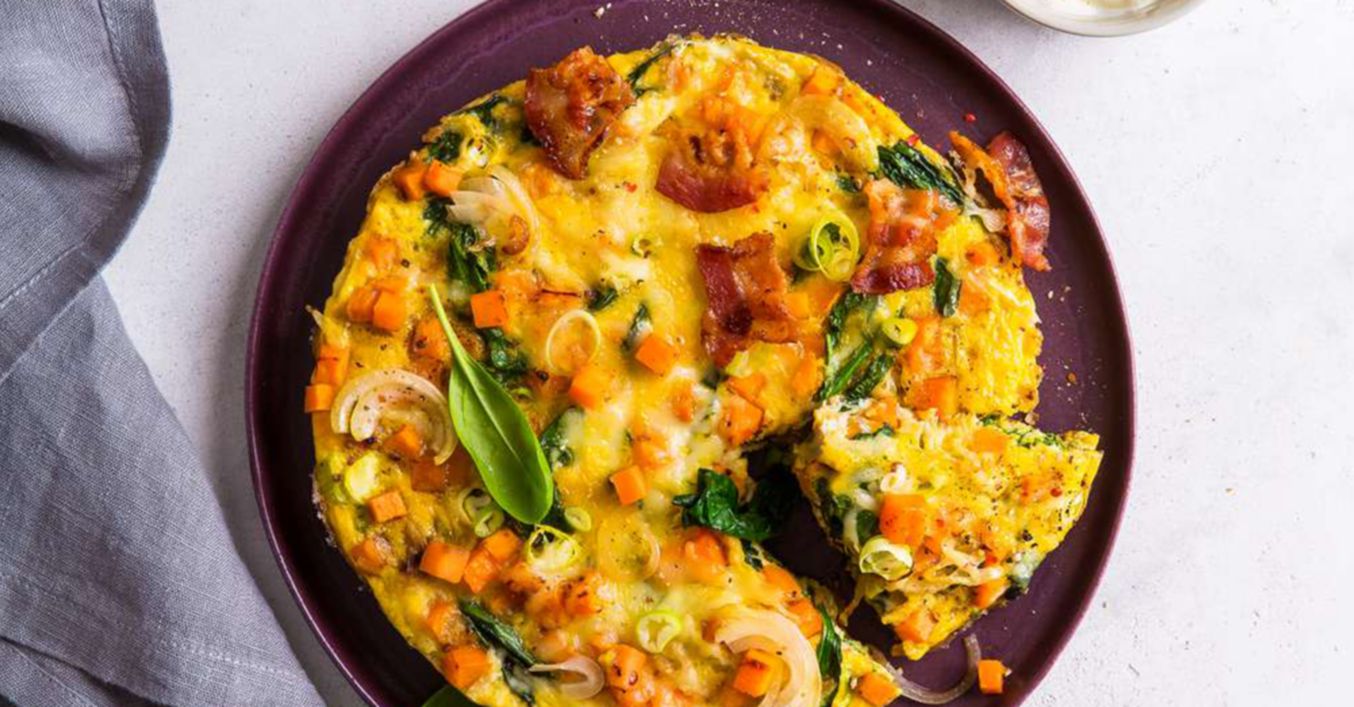 <bulletlist><bullet>Oguli batat i nareži ga na sitne kocke. Oguli i prepolovi luk i nareži ga na trakice. Očisti i operi listove špinata te ih dobro ocijedi. Operi i očisti mladi luk i nareži ga na sitne kolutove.</bullet><bullet>Slaninu preprži na tavi dok ne postane hrskava i ostavi je sa strane.</bullet><bullet>Na preostaloj masnoći i otopljenom maslacu na tavi preprži luk, dodaj batat i prži ga oko 3 minute, dodaj špinat i mladi luk i prži sastojke oko 2 minute.</bullet><bullet>Umuti jaja u posudi, začini solju i paprom. Prelij pržene sastojke umućenim jajima, dodaj ribani sir i promiješaj. Smanji na umjerenu vatru i stavi poklopac na tavu na petnaestak minuta.</bullet><bullet>U zdjelicu stavi kiselo vrhnje pa u njega naribaj malo korice limuna i dodaj sok pola limuna. Začini solju i paprom.</bullet><bullet>Omlet posluži u tavi sa slaninom i začinjenim vrhnjem.</bullet></bulletlist>