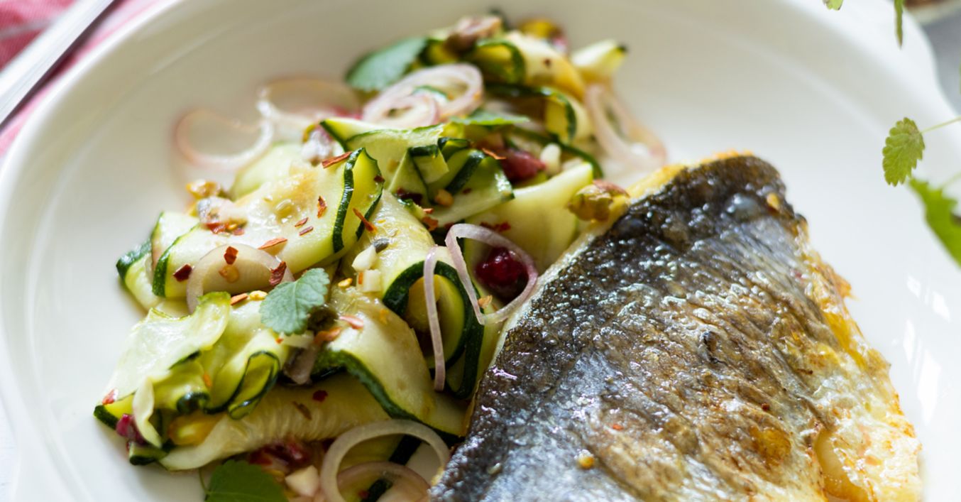 Pečenu ribu posluži sa salatom od tikvica, posutom s nekoliko listića mente.