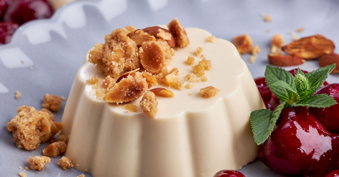Izvadi panna cottu iz kalupa i posluži s višnjama i začinjenim drobljencem. Uz to možeš poslužiti premium sladoled Cocoa Brownie robne marke K-Favourites.