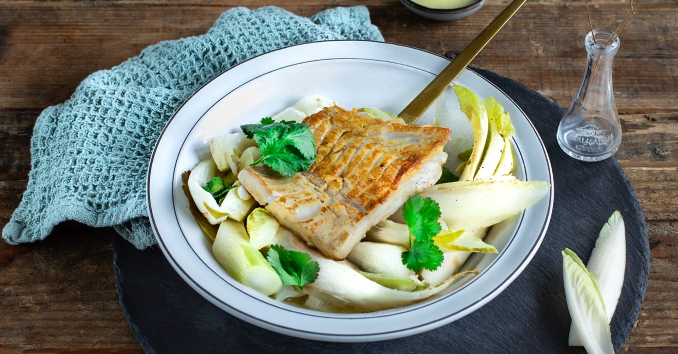 Ribu posluži na tanjuru s pirjanim komoračem i radičem. Ukrasi korijanderom.