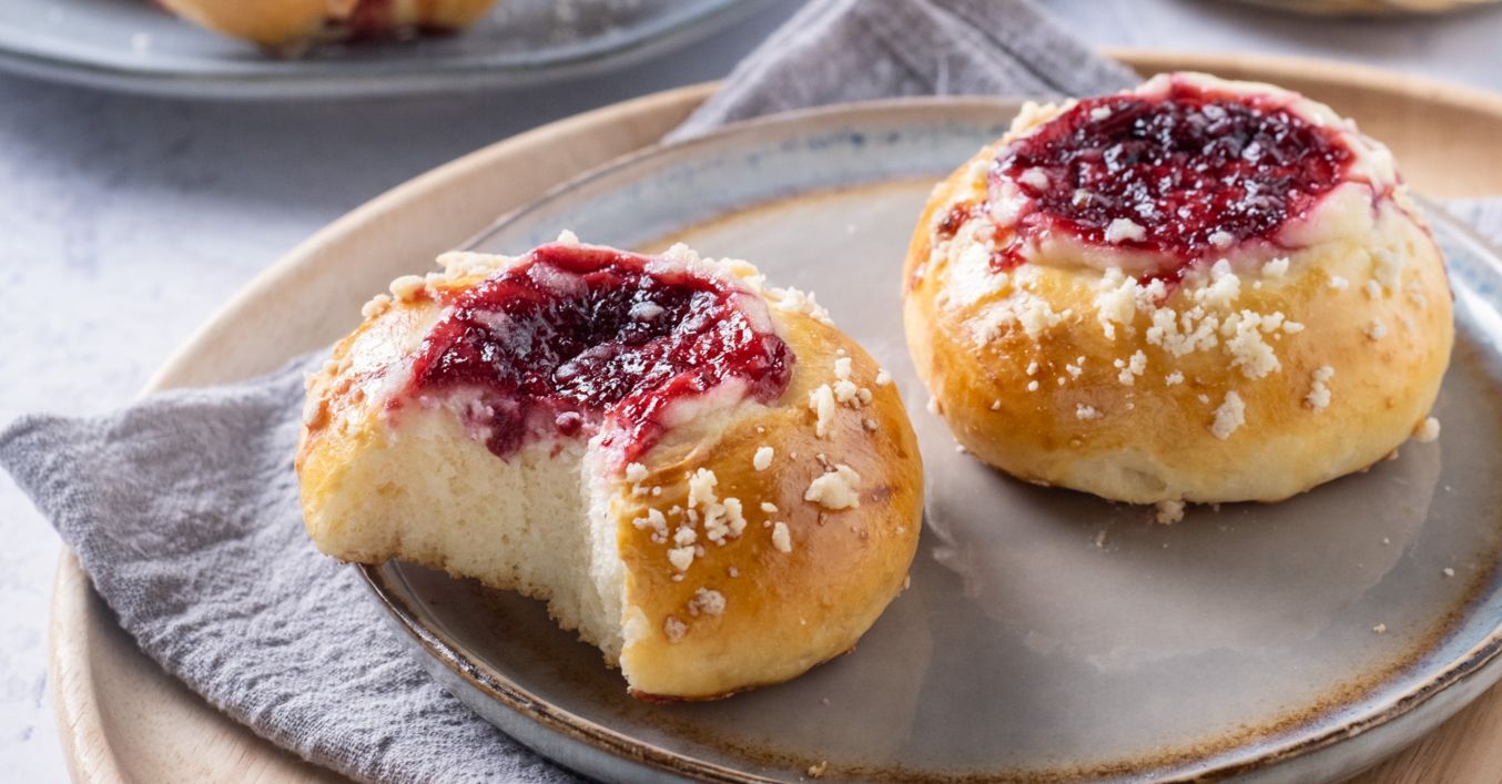 Loptice potom utisni dnom čaše, tako da rub ostane izdignut, odnosno, napravi nešto poput zdjelica u koje ćeš dodati nadjev. U udubljenja prvo dodaj nadjev od sira, otprilike jedna žlica nadjeva po pecivu. Utisni sir lagano žlicom pa na njega dodaj po žličicu voćnog namaza od višanja.