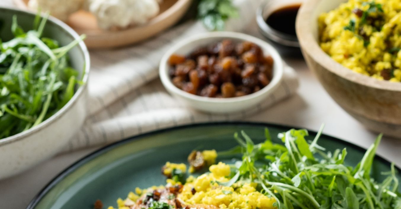 Začinjeni brancin posluži na podlozi od tople riže od cvjetače, prelij umakom i odmah posluži uz svježu lisnatu salatu.