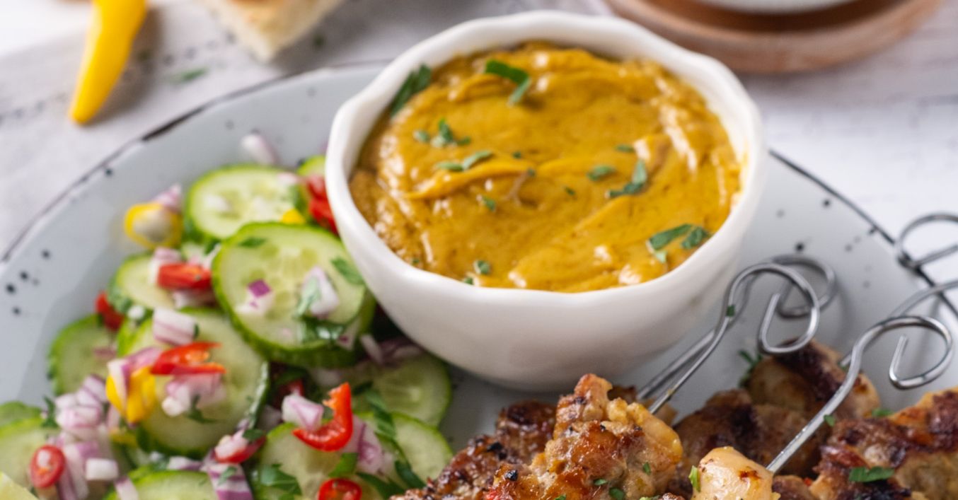 Dok se meso marinira, pripremi umak. U manjem loncu pomiješaj namaz od kikirikija, kokosovo mlijeko, curry i češnjak u prahu, smeđi šećer, sok cijele limete i koricu ½ limete, jabučni ocat, sol i mrvljeni čili.