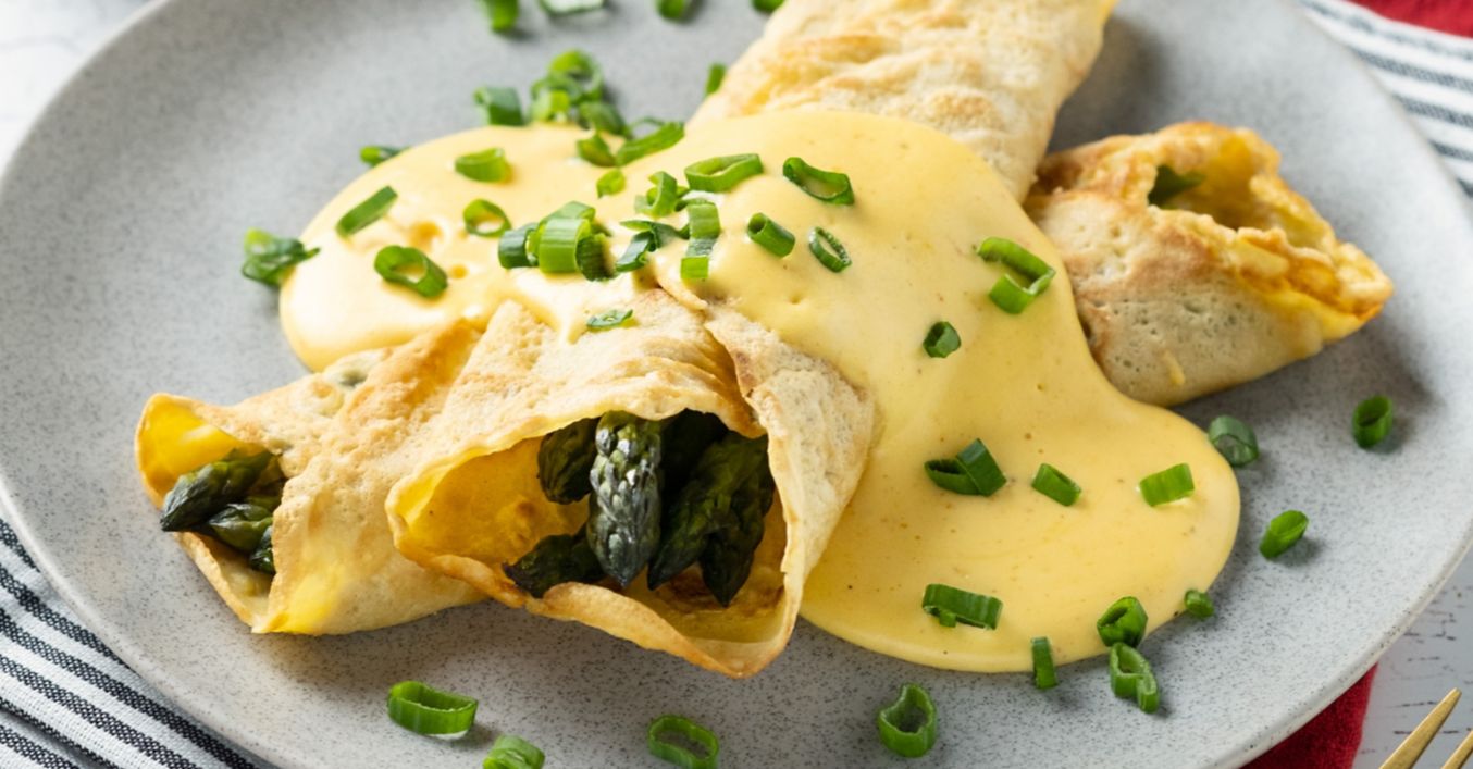 Na sredinu svake palačinke stavi dio šparoga, malo maslaca pa zamotaj tako da samo prebaciš krajeve prema sredini. U lim premazan maslacem posloži palačinke, a na vrh svake palačinke stavi još prutić ili kockicu maslaca. Peci ih na 180 °C oko 15 minuta.