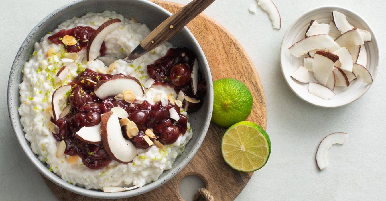 Na tavi bez ulja tostirati bademe dok ne porumene. Rižu na kokosovom lijeku servirati s kompotom od trešanja te ukrasiti bademima i listićima kokosa.