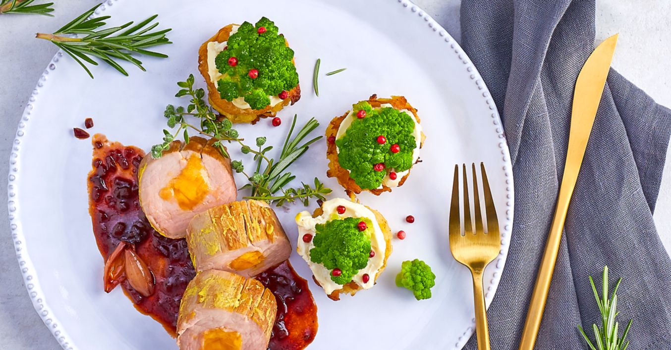 Kiselo vrhnje začinjeno prstohvatom soli i papra miješajte dok ne dobiješ glatku teksturu. Zatim žličicom rasporedi vrhnje na svaki popečak od krumpira. Ukrasi cvjetićima šenona da izgledaju kao božićna drvca i peci ih sa svinjskim fileom u prethodno zagrijanoj pećnici oko 15 minuta.