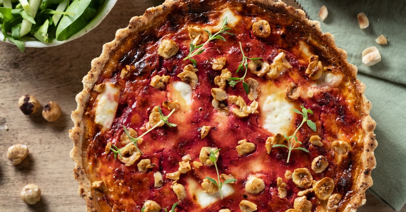 Temperaturu pećnice smanji na 160 °C, izvadi tijesto iz pećnice i na njega rasporedi nadjev od ribane cikle. Prelij mješavinom jaja i vrhnja i malo soli i po svemu rasporedi komade kozjeg sira. Pospi sjeckane lješnjake i peci oko 30 minuta ili dok se nadjev ne stisne i lijepo karamelizira