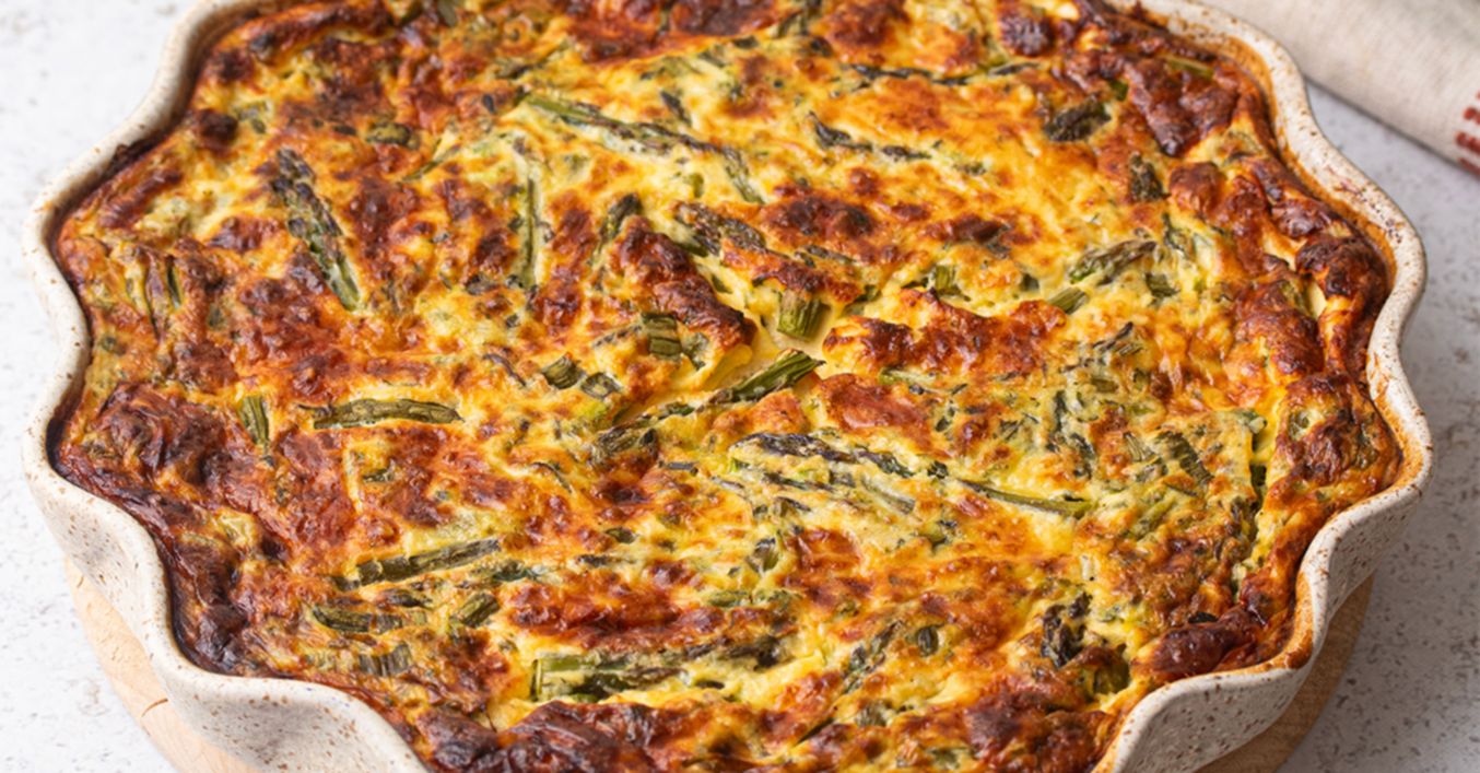 Kalup za quiche premaži s malo ulja, pa u njega rasporedi šparoge i mladi luk, posipaj ih naribanim Cheddar sirom i sve prelij smjesom od jaja i vrhnja.