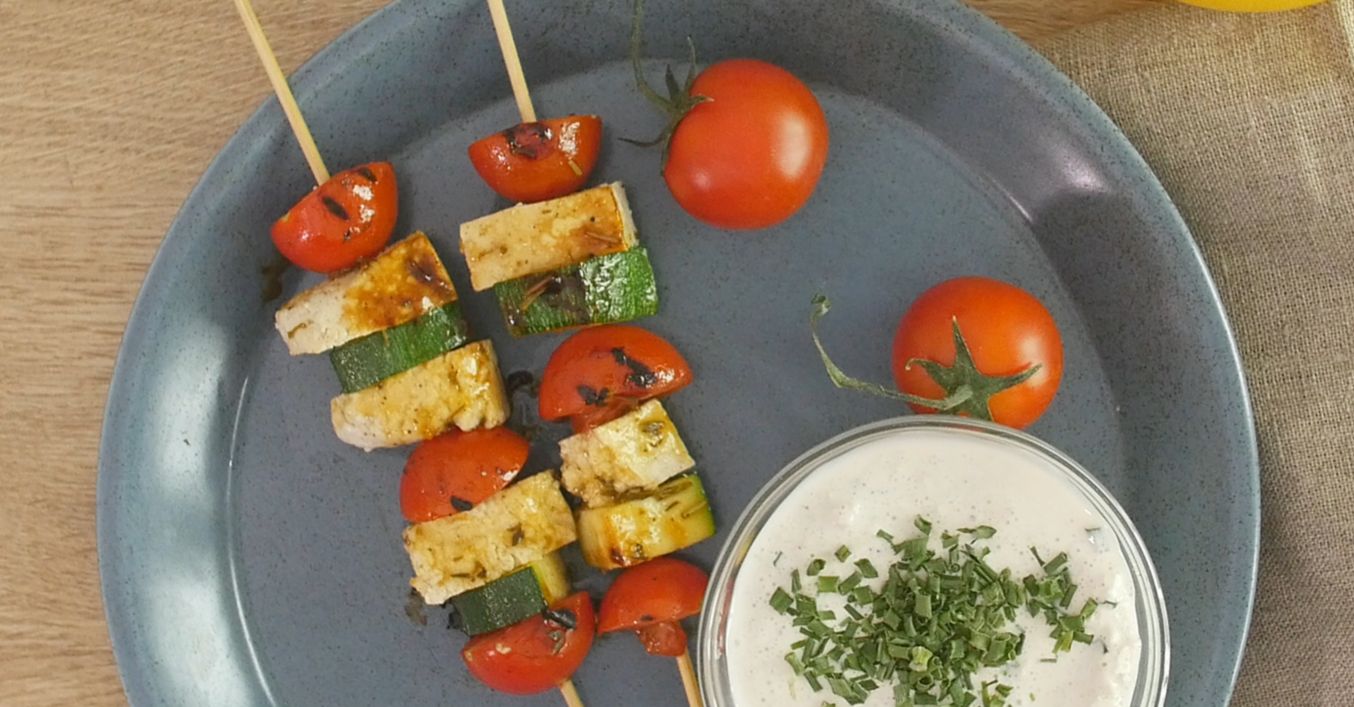 Tikvice operite i očistite. 300 g tofua, rajčice i tikvice narežite na komade veličine zalogaja. U lončiću prokuhajte sok od naranče, senf i začinsko bilje te kuhajte dok ne poprimi pomalo kremastu teksturu.Začinite solju i paprom. Komadiće tikvica, tofua i rajčica nabodite na drveni štapić za ražnjiće te prelijte pripremljenom marinadom od naranče i senfa.Ostatak tofua narežite na komadiće, pomiješajte sa zamjenom za vrhnje i zgnječite poput pirea. Umiješajte nasjeckani vlasac te začnite solju i paprom. Ražnjiće možete ispeći na roštilju, u grill tavi ili u pećnici – po želji. Poslužite s umakom.