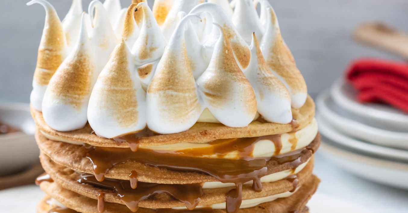 Koru premaži kremom, zatim stavi karamel umak i ponavljaj postupak dok ne potrošiš sve kore. Na kraju tortu ukrasi meringom.
