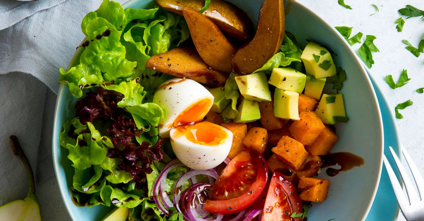 U posudu rasporedite zelenu salatu, avokado, rajčice, batat i kruške. U sredinu stavite dvije polovice jaja, na vrh stavite kolutove luka i polijte balzamičnim octom.