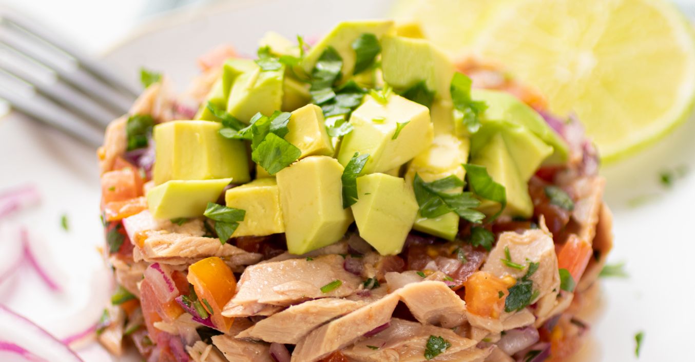 Ljubičasti luk sitno nasjeckaj. Ubaci ga u zdjelu pa prelij sokom jedne limete, začini solju i paprom te maslinovim uljem. Dodaj grubo natrgane filete tune, sjeckanu rajčicu (mogu biti i cherry rajčice) i sjeckani korijander.
