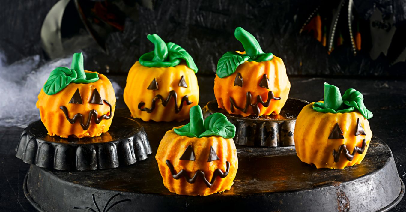 Za glazuru pomiješaj šećer u prahu s ostatkom soka te dodaj jestive boje i pomiješaj. Odvoji dvije žlice glazure i stavi sa strane. Premaži kuglofiće i ostavi da se osuše, a nakon toga premaži glazurom dno svakog kuglofa i spoji po dva tako da dobiješ oblik bundevica. Pusti da se osuši.