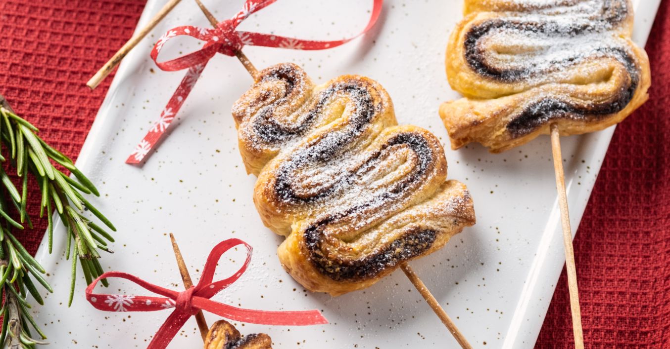 Svaku trakicu presavij valovito tako da oblikuješ borić. Kroz sredinu donjeg šireg dijela tijesta pa do vrha probodi štapić za ražnjić. Štapiće možeš prethodno namočiti u vodi kako ne bi izgorjeli u pećnici.