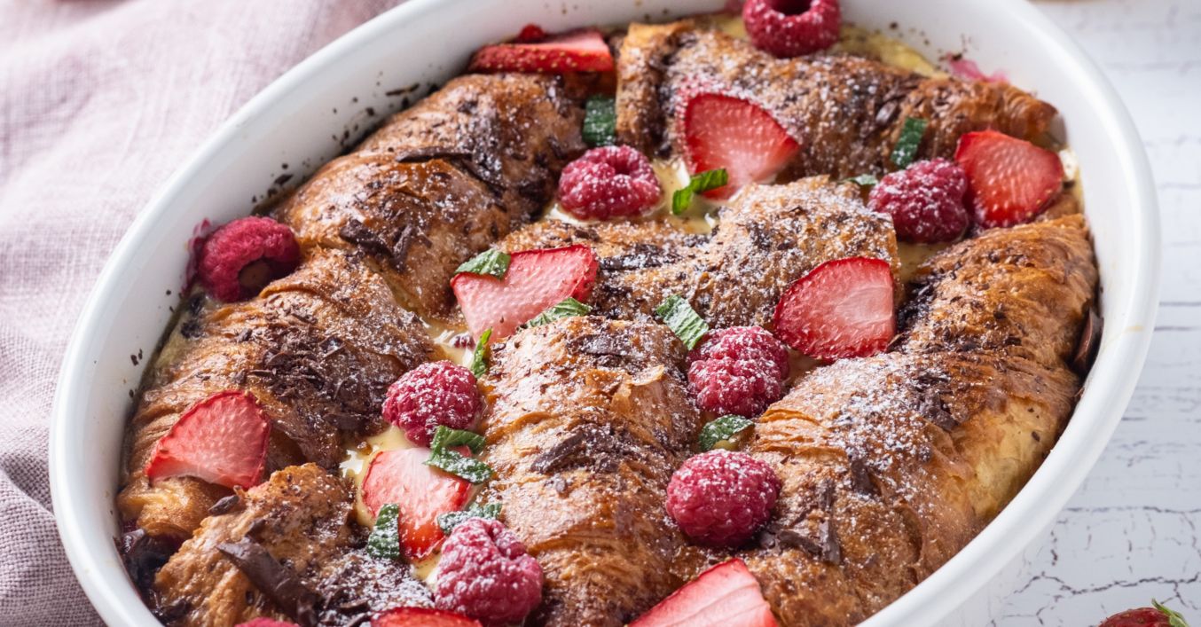U posudu posloži donje dijelove kroasana tako da ispuniš dno. Potom prelij smjesom s jajima, potroši pola količine. Pospi polovicom količine čokolade, jagoda i malina. Zatim posloži gornje polovice kroasana tako da prekriješ cijeli donji dio.