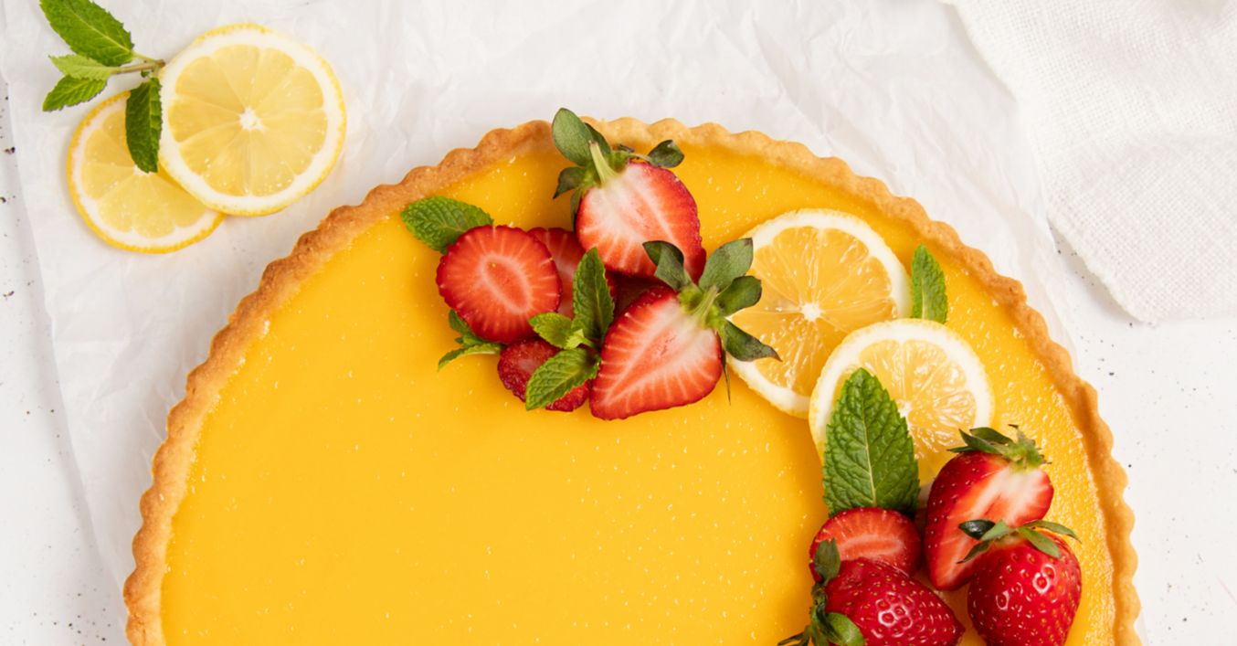 Sve sastojke za kremu stavi u lončić i kuhaj miješajući dok ne dobiješ gustu kremu. Procijedi kremu kroz sito pa je prelij preko tijesta. Stavi peći dodatnih 5 minuta na 200°C. Ostavi da se ohladi na sobnoj temperaturi pa prebaci u hladnjak. Posluži s voćem po želji.