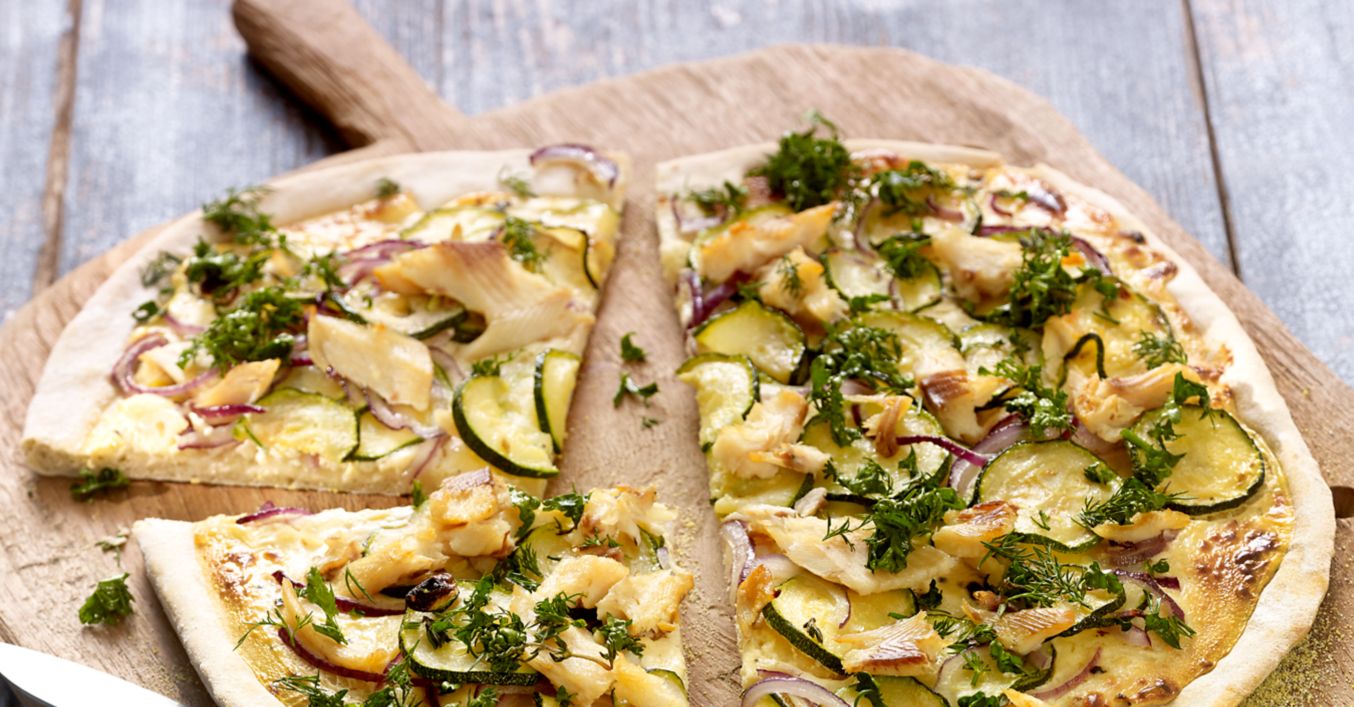 Tijesto na malo pobrašnjenoj radnoj površini razvaljajte u 2 kruga (promjera 28 centimetara) i premažite kiselim vrhnjem. Pastrve vilicom natrgajte na komade.
