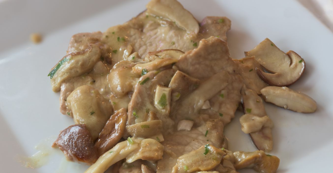 U istoj tavi pirjaj usitnjeni luk, češnjak i šampinjone (narezane na veće komade) oko 10 minuta.Dodaj začine, senf, vrhnje i vodu. Dobro promiješaj, dodaj kotlete pa kuhaj poklopljeno još 15-20 minuta.