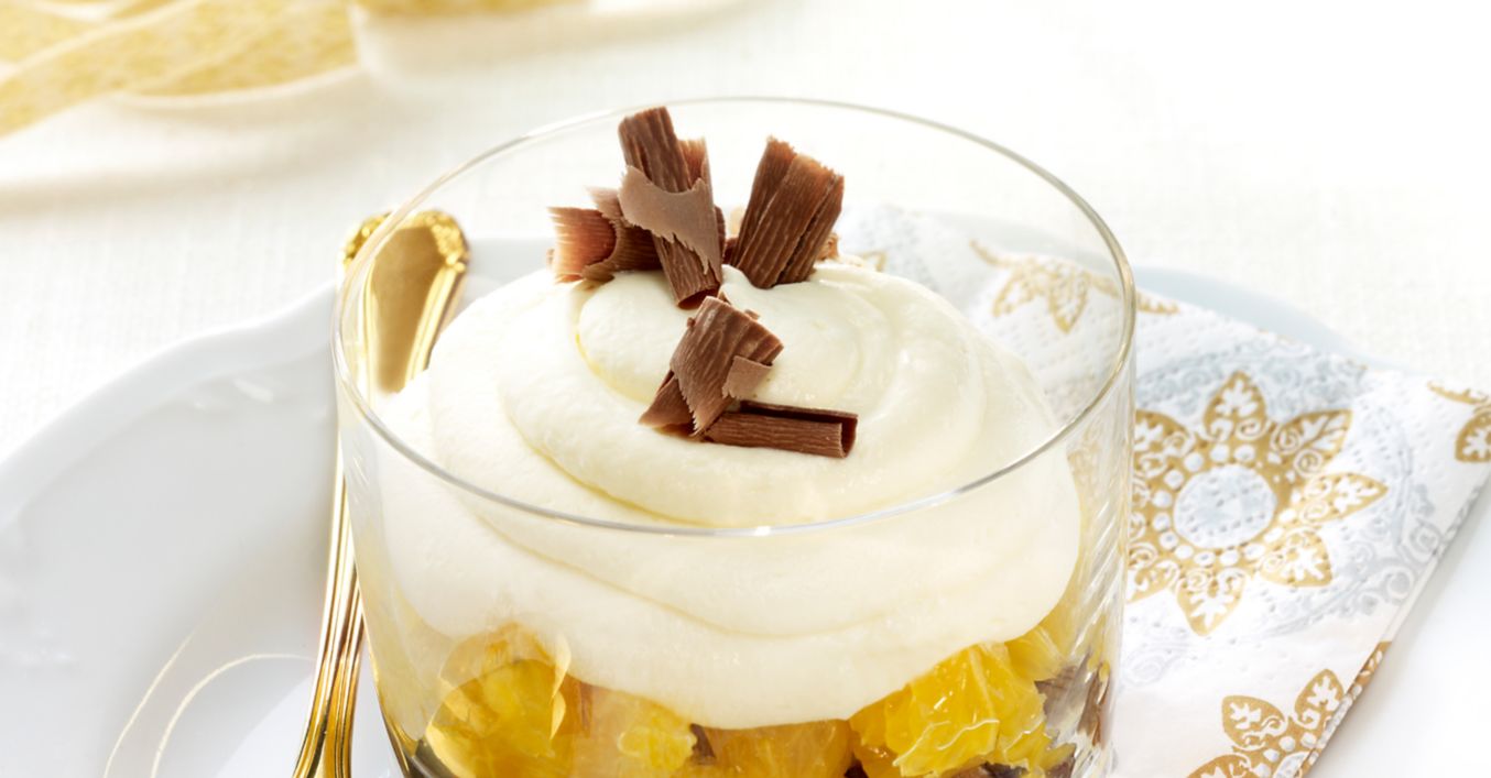 Pomiješajte mascarpone, jogurt i šećer. Marinirane komadiće naranče rasporedite u čaše, potom dodajte kremu od sira i jogurta te stavite dva sata u hladnjak.