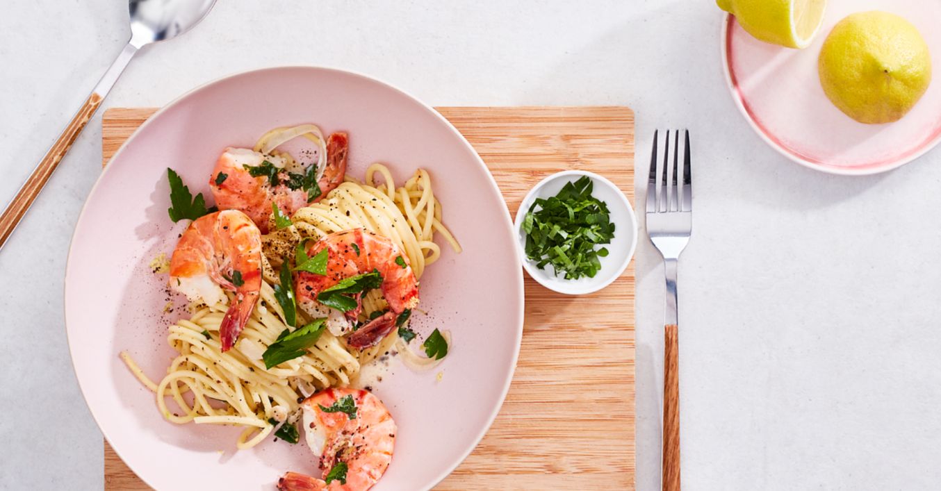 Očisti kozice, zagrij ulje na srednjoj vatri i peci kozice zajedno sa lukom i češnjakom oko 3 minute. Dodaj vrhnje, maslac, limunov sok i koricu. Dodaj špagete i peršin te začini paprom.