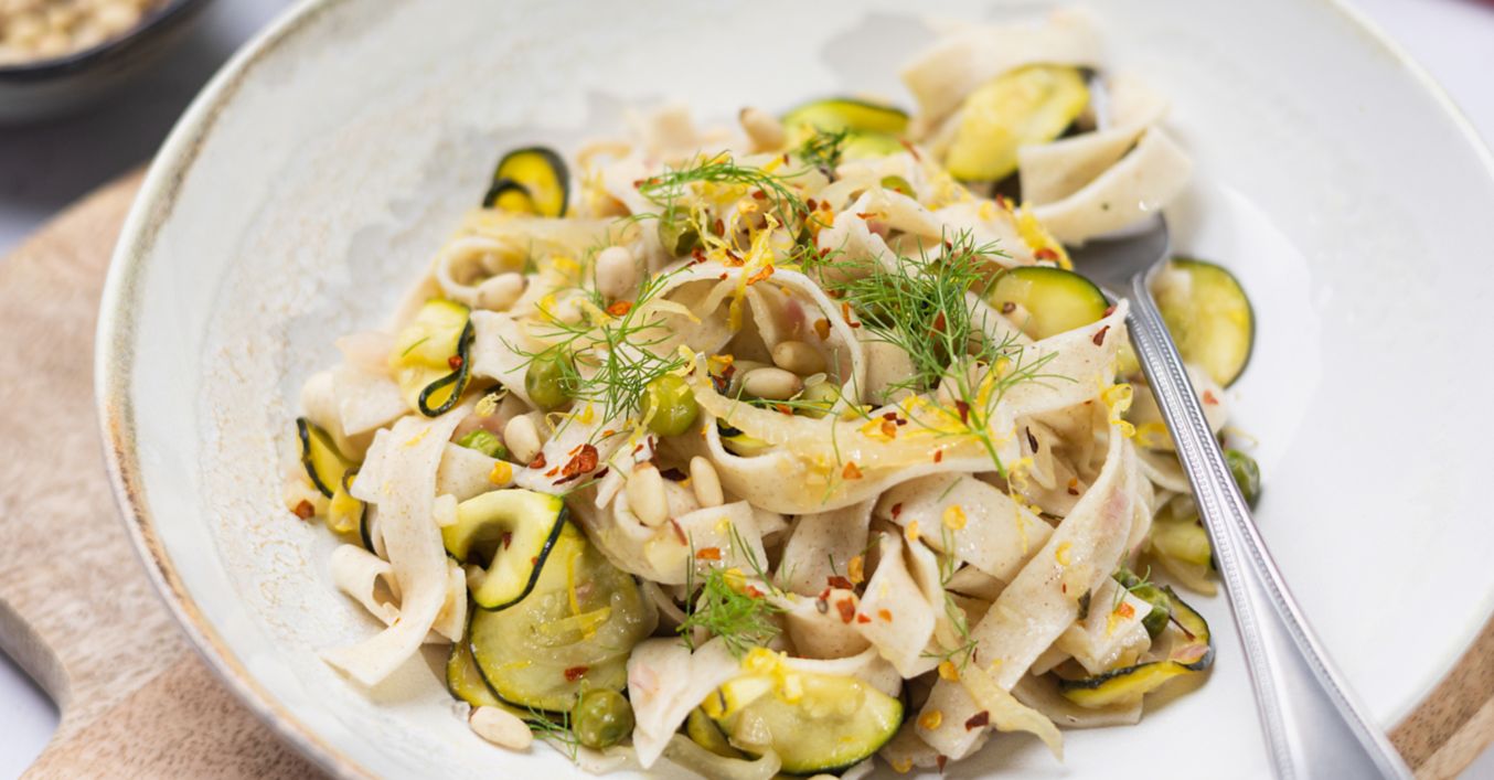 Skuhaj tjesteninu prema uputama na pakiranju.U međuvremenu sitno nasjeckaj ljutiku i češnjak pa ih kratko pirjaj na malo maslinova ulja. Dodaj tanko narezani komorač, tikvicu narezanu na kolutove ili trakice te grašak. Začini solju, paprom i čilijem te dodaj sok i naribanu koricu limuna. Pirjaj 10-ak minuta dok povrće ne omekša.Skuhanu tjesteninu dodaj u povrće pa sve pospi tostiranim pinjolima. Posluži toplo.