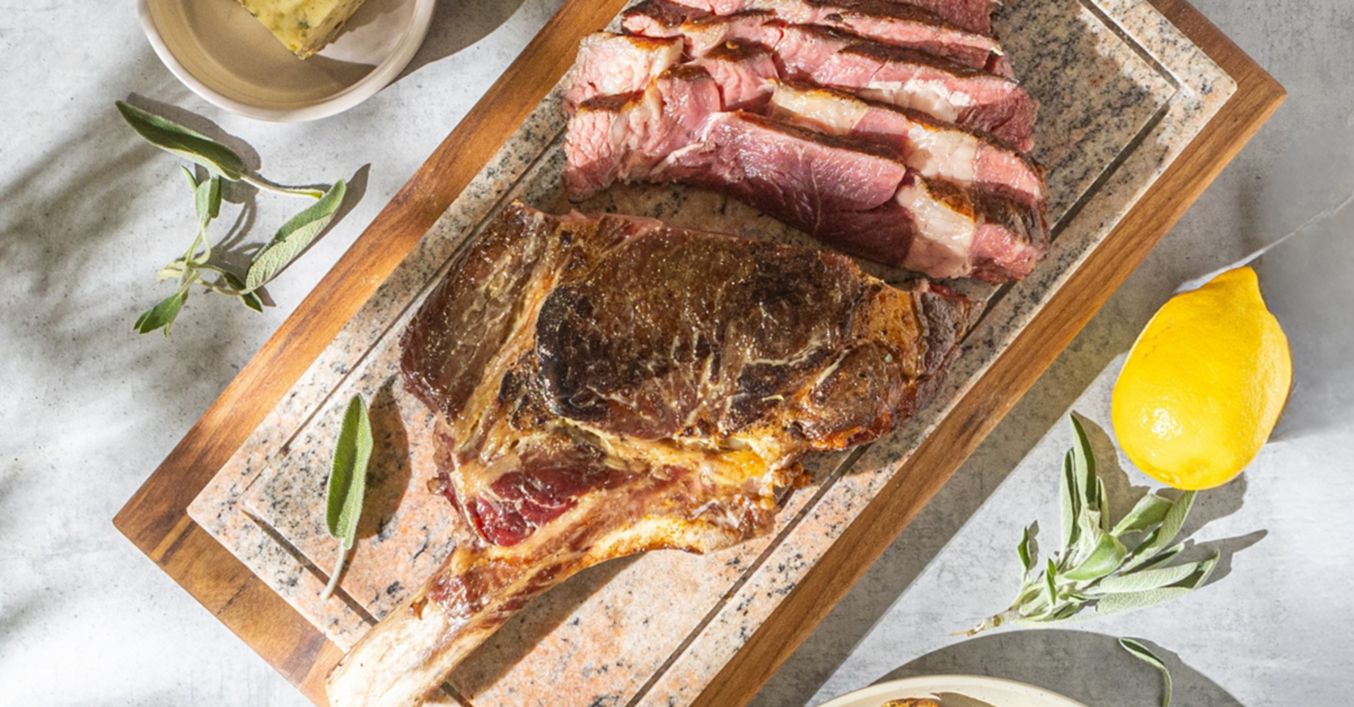 Posluži tomahawk uz krumpir pečen u goveđoj masnoći i grillane šparoge.
